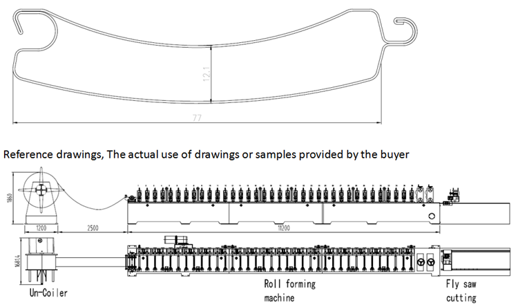 开卷机---送料导向---成型---预热--- PU发泡注塑---保温---成型---整平---伺服跟踪飞锯切---平台输送机 ---机械冲孔---出料